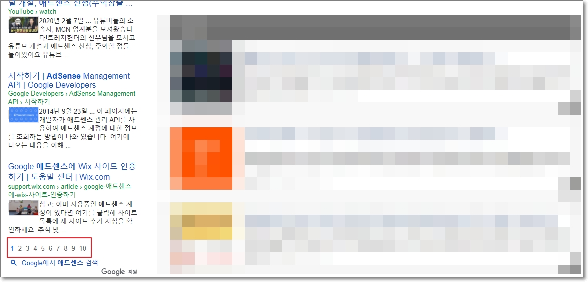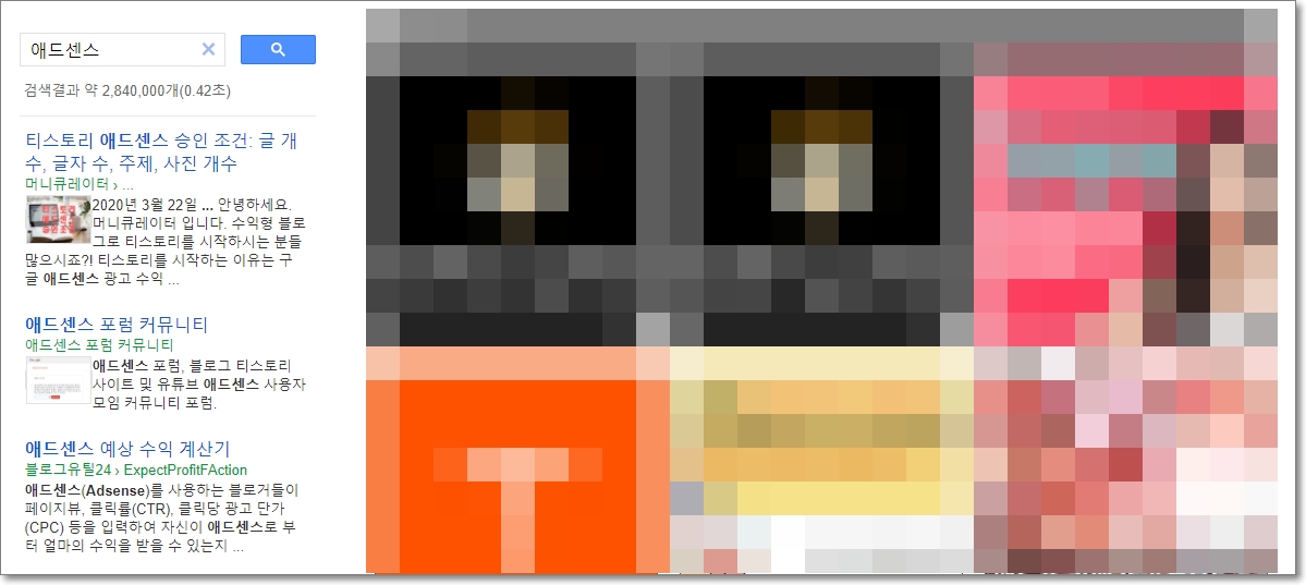 실제로 검색을 했을 때의 화면입니다. 직접 검색을 하면 '사이드 바'가 아래로 밀리면서 사용자가 검색한 결과 화면이 노출됩니다. 아마 이 화면을 통해 노출되거나 클릭되는 것들이 애드센스 수익에 반영되는 것이지 않을까 생각해봅니다.