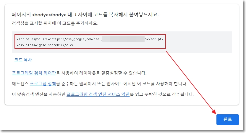 선택을 하셨다면 완료 버튼을 누르기 전에 생성된 HTML 코드를 복사해주세요. 해당 HTML 코드가 적혀 있는 부분을 [Ctrl+C/V]로 하셔도 되고 화면에 나와 있는 [코드 복사] 버튼을 눌러 하셔도 됩니다.