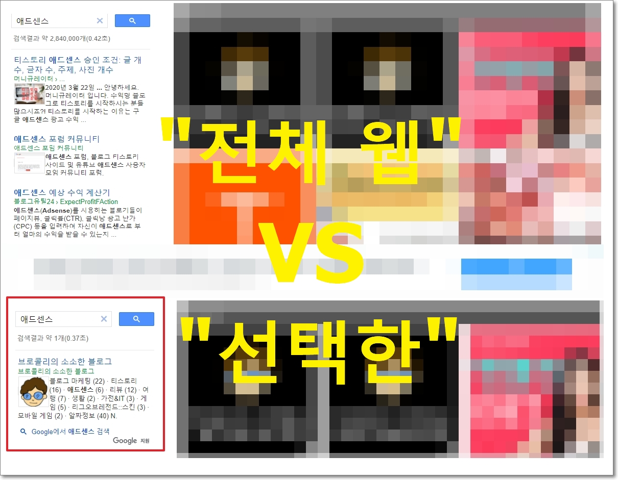이 두 가지의 차이점은 무엇일까요? 위에서도 잠깐 언급했듯이 나의 티스토리 블로그에 설치되어 있는 '구글 검색창'으로 인해 검색되는 결과물이 구글 포털 사이트 전체를 그 영역으로 할 것인지, 아니면 나의 블로그에만 국한 시킬 것인지 선택하는 것입니다. 그렇다면 이 둘의 장·단점은 무엇이 있을까요?