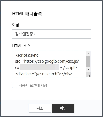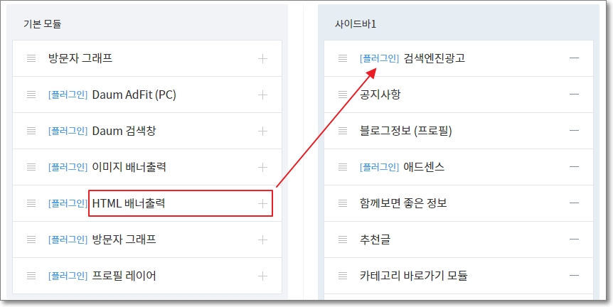 그리고 [관리자-꾸미기-사이드 바] 순서대로 들어가셔서 [HTML 배너출력]이라고 되어 있는 우측 부분의 [+]를 누르셔서 조금 전에 복사한 광고 코드를 '붙여넣기' 해주세요! 바로 아래처럼 'HTML 소스'라고 적혀 있는 부분에 광고 코드를 붙여넣기 해주시고 [확인] 버튼으로 작업을 마무리 해주시면 됩니다! 마지막으로 해당 모듈의 위치를 드래그하여 조정해주신 후에 [변경사항 저장]을 클릭하셔서 작업을 마무리 해주시면 되겠습니다!