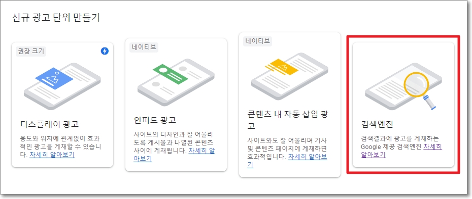 그리고 우측쪽의 [검색엔진] 광고를 생성하기 전에 "자세히 알아보기"를 클릭하셔서 해당 광고가 어떤 내용의 광고인지 간단하게나마 확인을 해주세요!